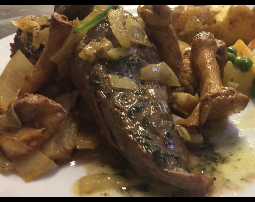 Genießen Sie ein zartes, auf den Punkt gegrilltes argentinisches Rinderfilet, begleitet von frisch gebratenen Pfifferlingen und aromatischen Zwiebeln, fein veredelt mit einem Hauch Weißwein.